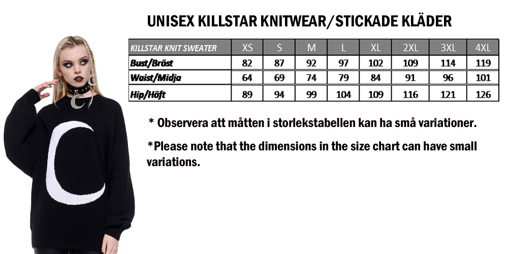Killstar Belinda knit sweater. Den är säsongens måste för den moderna häxan – åka varje dag! Säg hej till vår “Belinda” stickade tröja; perfekt för kyla/äventyr/kalla dagar/vad som helst. Supermjuk ribbstickad med rund hals, långkropp och fladdermusärmar med ärm slut. Mångsidig så att du kan klä upp dig eller ner beroende på din måne/humör.