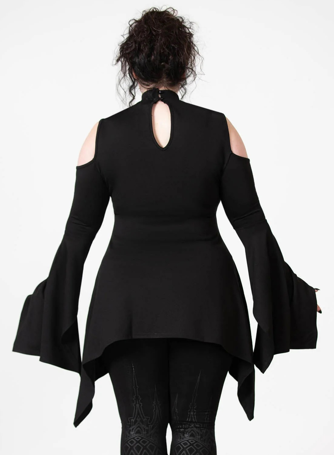 Топ Killstar Moonshine с открытыми плечами изготовлен из мягкого эластичного материала. Верх имеет кружевной вырез в форме полумесяца спереди. Только бретельки и подол в виде платка придают верху воздушность, а длинные рукава и высокий воротник придают ему элегантный и загадочный вид.