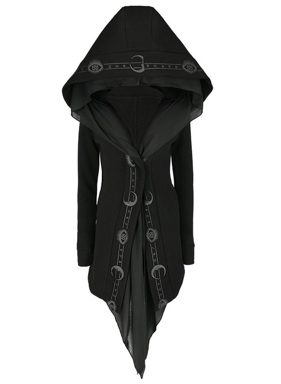 Обновленная толстовка с капюшоном «Гадалка». Эта феноменальная толстовка в готическом стиле от Restyle Clothing идеально подойдет к вашему альтернативному образу. Длинная и очень теплая, изготовлена из плотного высококачественного хлопка с вуалью, пришитой по всей длине капюшона, что придает еще больше загадочности. Две пуговицы подчеркивают талию. Большой капюшон сохранит тепло и сухость в дождливые и ветреные дни.