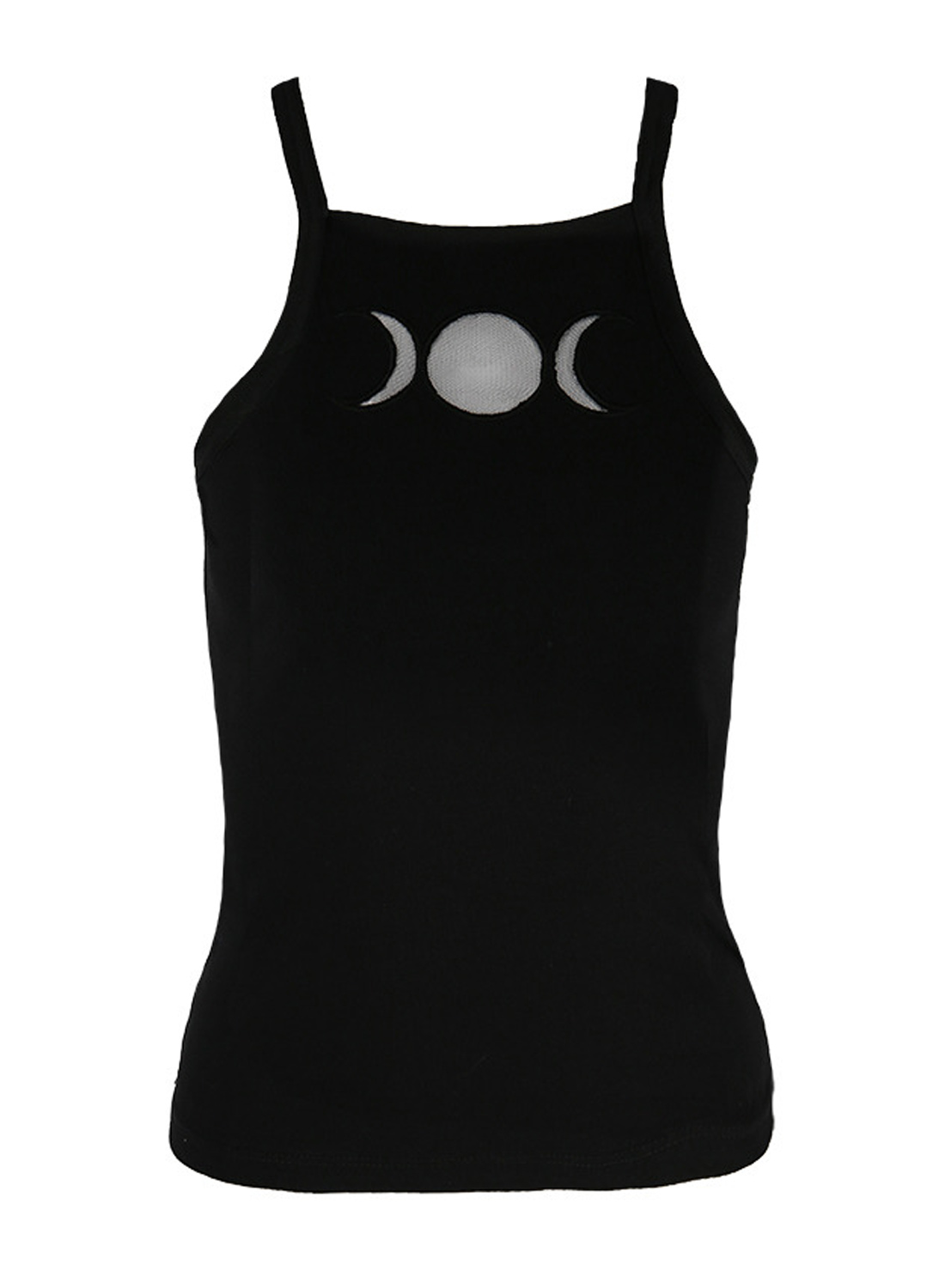 Топ Tripel Goddess Black Top — стильная, оккультная майка от Restyle. Облегающая модель с открытыми плечами — вырез в виде тройного полумесяца над грудью из прозрачной сетчатой ткани.