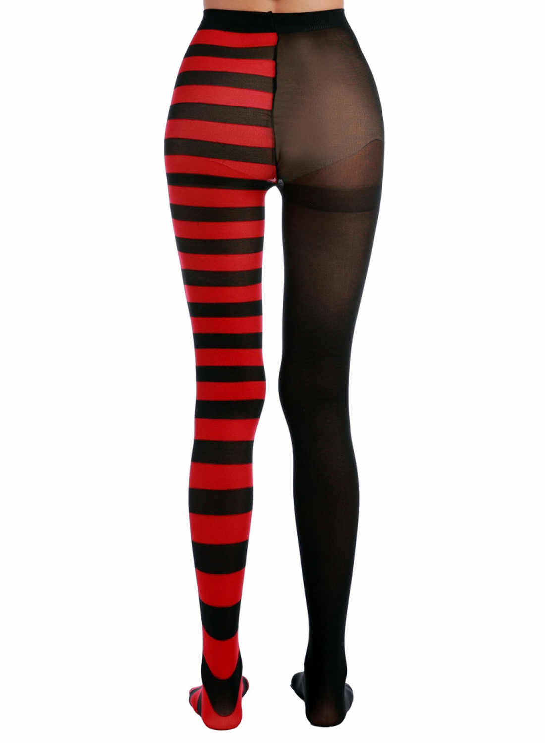 Пара действительно крутых колготок в стиле Гот-рокстиль: одна сторона в красно-черную полоску, а другая сторона - полностью черный, эластичный материал размера Onesize.